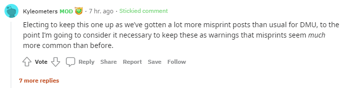 “Electing to keep this one up as we’ve gotten a lot more misprint posts than usual for DMU, to the point I’m going to consider it necessary to keep these as warnings that misprints seem much more common than before.”