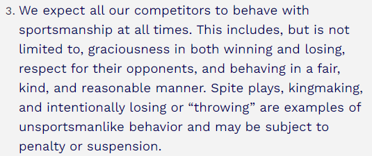 2) In a competitive setting, events need to have a policy that addresses collusion, because there are a LOT of opportunities to collude in Commander.