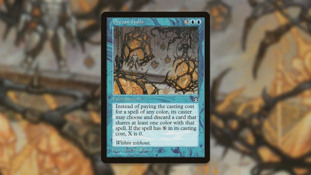 The main combo piece this deck is centered around is Dream Halls. It essentially acts as an Omniscience for both players, except that in order to cast a spell for free, the player needs to discard a card that shares a color with the spell in question.