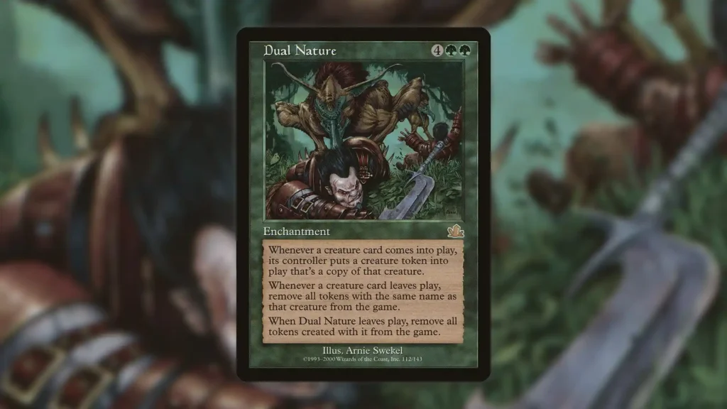 As a six-mana enchantment with a symmetrical effect, Dual Nature may not seem like it’s worth the cost. Things get even tougher with Duel Nature’s additional downside, blowing up copies it makes when the original leaves play.