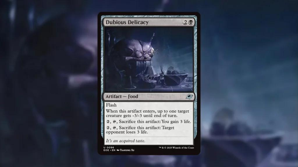 I wouldn’t have put it past Wizards of the Coast if they had made Dubious Delicacy a rare. The card probably won’t be very successful in constructed, but as far as Limited goes, Dubious Delicacy is a Swiss army knife that functions as synergistic removal. The amount of value it can create for three mana is absurd.