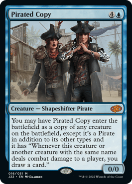 Pirated Copy is the new card spoiled amongst this pack. Pirated Copy simply enters the battlefield as a copy of any other creature in play, but it gains the Pirate creature typing and has an additional ability that allows it or any creature with the same name as it, to draw you a card when they deal damage. Interestingly, this means if you copy an opponent’s creature, you get to draw a card whenever it does combat damage, regardless of who it damages to. Honestly, this is a very cool design that could be considered a payoff in any deck that wants to create multiple tokens. Just make the pirate copy a token and draw a card for each token that deals damage with the same name.