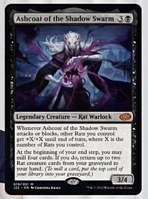 There are a lot of Relentless Rats fans that are incredibly excited about their new overlord. Ashcoat of the Shadow Swarm offers a buffing effect as well as a ton of value over time for in its second ability. To add to the excitement, because of its recent reprint in Double Masters 2022, Thrumming Stone, which used to be a $50 card, is now incredibly cheap! It’s never been a better time to be a fan of rats in MTG! If you want to see more of the reprints featured in the Rat theme, AdamTheGathering highlights some of them in his Tweet above.