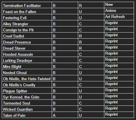 Previewed by Twitter user @andremanentii, Termination Facilitator is the only card amongst the pack spoiled on that channel. A lot of the other cards in the deck are interested in dealing small amounts of recurring damage, and Termination Facilitator can turn that damage into kill spells. This, therefore, is interesting in a Pinger archetype in Commander. Unfortunately, most Pinger archetypes are in the Izzet colors, so a black payoff may not fit perfectly into the deck. Either way, listed above are all the cards contained within this pack. The two new arts previewed with this pack (on reprinted cards) are pictured below.