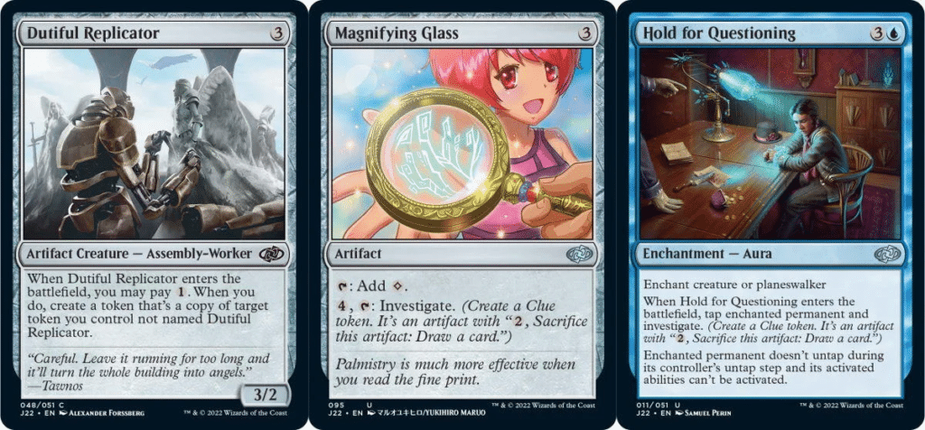 comicbook.com featured two of the new pack themes for Jumpstart 2022. The first of which is the ‘detective’ theme which seems to focus on Investigating and creating Clue tokens, as the name suggests. Pictured above are the new cards Dutiful Replicator and Hold for Questioning. These aren’t incredibly powerful, but are some fun new additions coming with Jumpstart 2022. Magnifying Glass is the anime art reprint of the pack.