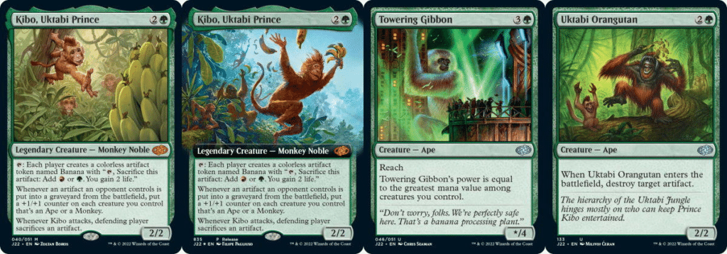 Kibo, Uktabi Prince was spoiled a little while ago, but it and Towering Gibbon are the two new cards coming with this theme in Jumpstart 2022. Uktabi Orangutan, an ancient MTG card, is also getting a rehash with a modern look. If you’re interested in finding out what the rest of the cards in these themes are, they are amongst the spoilers listed at comicbook.com.