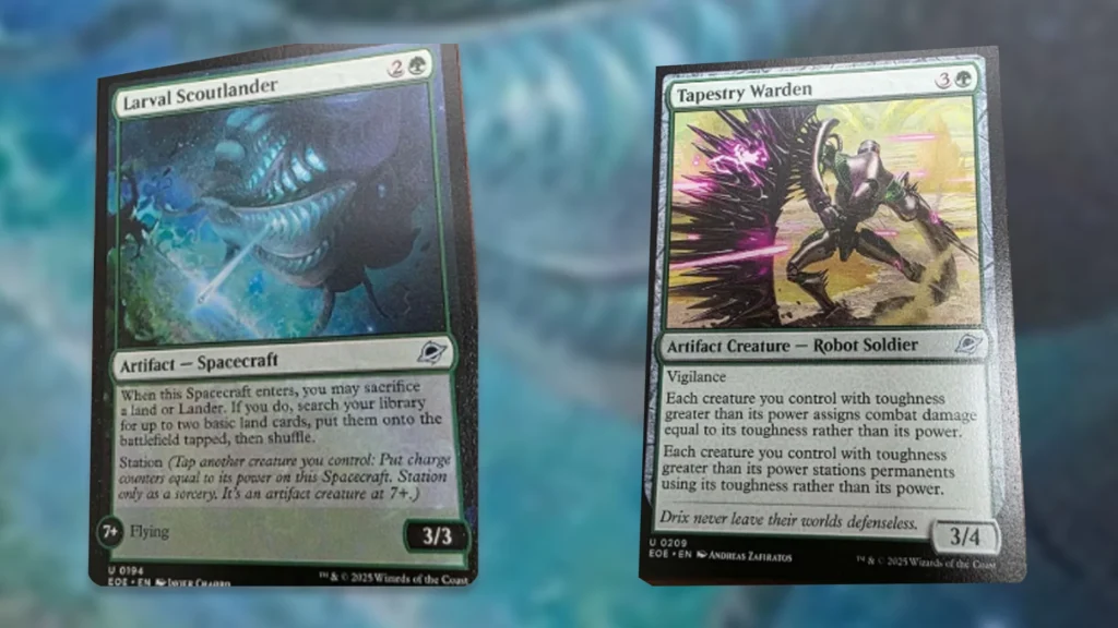 Larval Scoutlander and Tapestry Warden aren’t the most exciting leaks in the world, yet they do have some potential. The Station cost is rather hefty on Larval Scoutlander, and the reward of getting a 3/3 flier isn’t huge. Luckily, you get most of your value up front with a reasonable Harrow-esque effect. With some Landfall or graveyard synergies, this card can pull its weight at least in Limited.