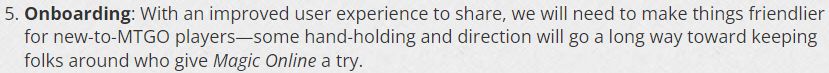 “One of the unique aspects of Magic Online is the support for multiplayer, but there are a lot of things that can be done to make the experience quicker and clearer. We want to make Magic Online the Commander destination, and the experience needs improvement before that can happen.”
