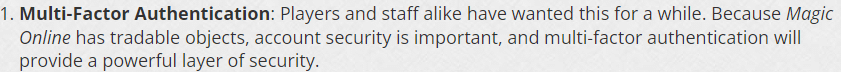 Because MTGO accounts can become rather valuable, they can also become targets of some malicious parties looking to take advantage of a potential lack of security. This boost in security should help players feel more confident that their valuable MTG collections will not be pilfered against their wishes.