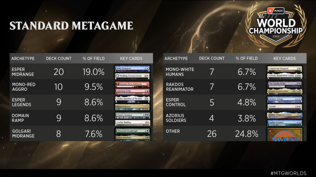 Esper decks featuring Raffine not only dominated the tournament, but the finals of the World Championship saw Jean-Emmanuel Depraz emerge victorious with Esper Legends over Kazune Kosaka wielding Esper Midrange. The top 8 of the World Championship showcased 3 Esper decks and 2 Domain Ramp decks, with Azorius Soldiers, Golgari Midrange, and Bant Control rounding out the last three spots.