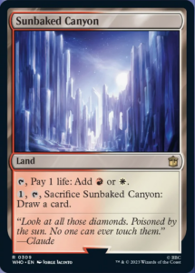 Sunbaked Canyon helps by doubling as card draw when you don’t need it anymore. Of course, it’s better to draw your preferred ratio of lands to spells, but Sunbaked Canyon can up the consistency of your game consistently by turning into card draw if you need more gas.