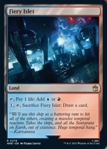 This is the principle that these lands follow. Fiery Islet, also seeing a reprint in the Doctor Who Commander decks, sees a ton of play in Modern in Murktide decks while also occasionally appearing in Crashing Footfalls, Burn, Merfolk, and Storm decks in Legacy. Additionally, Waterlogged Grove, the Simic land for the Horizon cycle, also has a confirmed reprint in the Doctor Who Commander deck series.