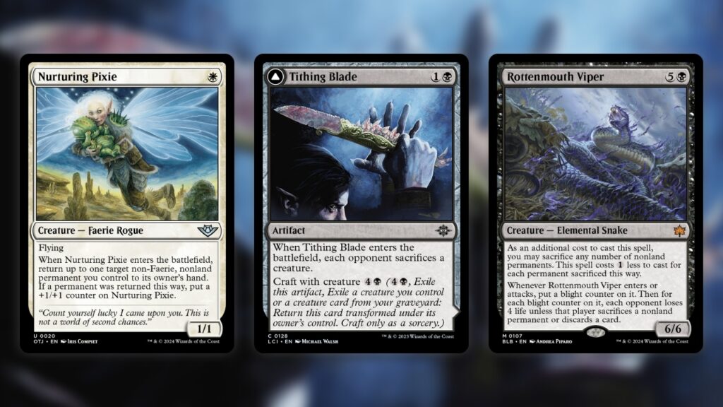 Fae Blade, also known as Orzhov Pixie, is a bit of an enigma when it comes to MTG lists. In many ways, it resembles the Orzhov Sacrifice lists we saw earlier in the format. The deck plays plenty of cards that create tokens, like Novice Inspector and The Witch’s Vanity, and pairs them with Nurturing Pixie for value. That’s where the ‘Fae’ part of the deck name comes from.