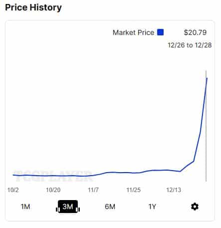 TCGPlayer nearly sold out of The Tiger’s Shadow. At the time of writing, there are only 20 listings remaining for the regular art Yuriko, 20 listings for The List version, and less than 20 for the etched foil. And the lowest you can get a Yuriko is now $22.00+! Just check out how the card’s price shot up in the graph below.