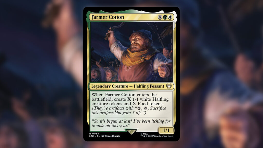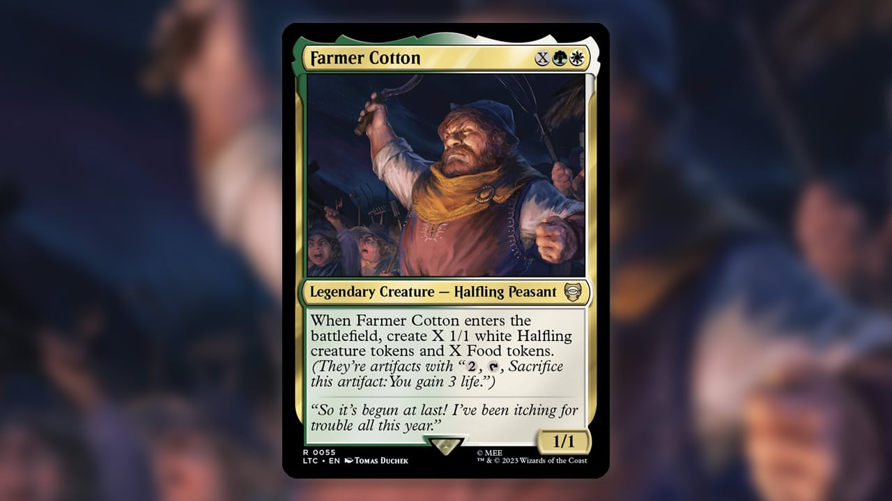 - Card Text: When Farmer Cotton enters the battlefield, create X 1/1 white Halfling creature tokens and X Food tokens.