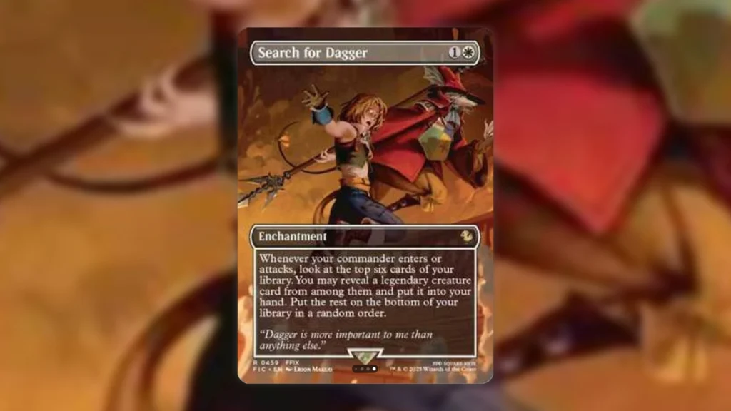 Our last white card is Search for Dagger. Search for Dagger is much narrower than the previous two cards. Not only do you need to be consistently attacking with your Commander or blinking it to get the most out of this enchantment, you also need a high density of legends in your deck to maximize the effect.