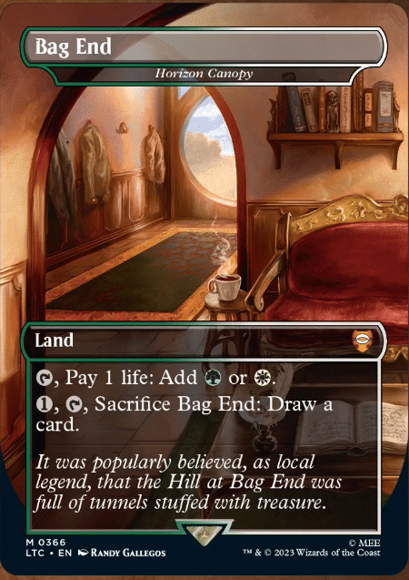 Just like Frodo sold Bag End as he began on his adventure, you can now sell Bag End to prepare for yours! Horizon Canopy is definitely one of the more expensive cards in the Horizon Land cycle, and these commonly see Modern play. Lands that turn into card draw are also rather valuable in the Commander format since games tend to go quite long. This makes flooding a real issue, so having something to do with your lands can help you get to gas faster.