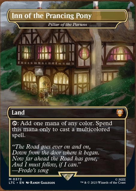 We have another stinker for your consideration, but the location offered in the LOTR IP is a rather interesting one. Many legendary characters have appeared in the Prancing Pony, and many Legendary Creatures (that are multicolored and not necessarily Legendary) are likely to be casted by this card.