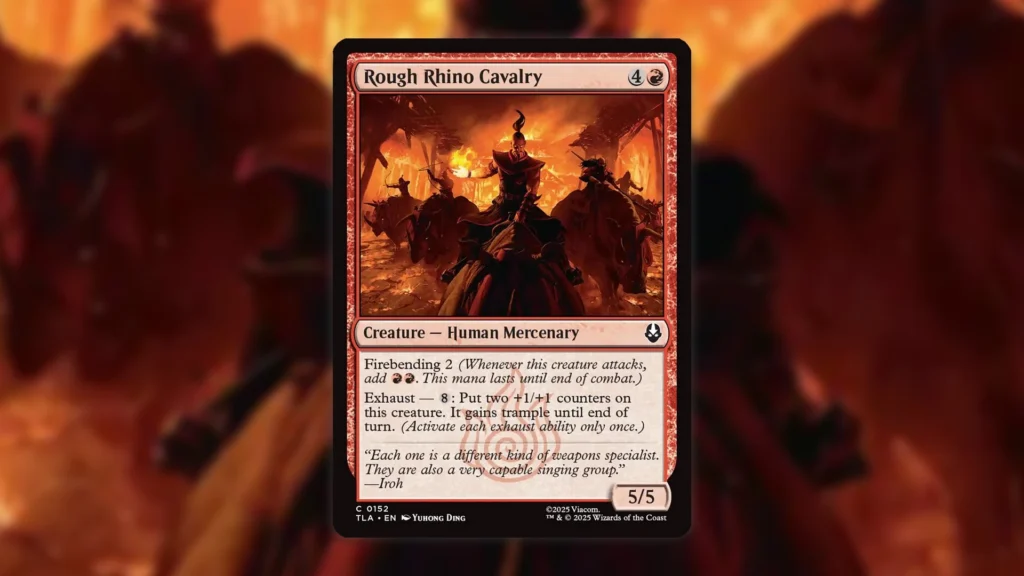 Firebending is primarily featured in red in MTG Avatar, a primarily aggressive color. Yet, at common, Fire Nation Cadets is the only Firebending creature in the main set that costs less than three mana. The card does perform admirably as a result, which suggests that Firebending, when done right, has potential. The other two cards to feature the Firebending mechanic at common, Rough Rhino Cavalry and Vindictive Warden, are extremely mediocre.