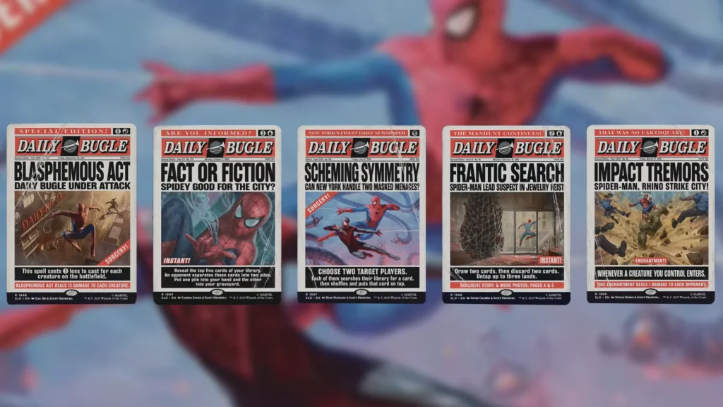 A ton of new MTG Spider-Man spoilers were revealed yesterday. From famous villains to City Pigeons, there was a lot for fans of Marvel and Magic to be excited about… at least for cards that appear in the main set. Some cards were also revealed that will not appear in the main set, and from a reprint perspective, there’s a lot to be desired.