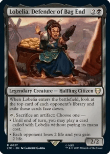 Do you enjoy playing Arvinox, the Mind Flail, or Xanathar, Guild Kingpin? What if they cost three mana? I’m not sure why [tooltip]Lobelia, Defender of Bag End, is in this deck, but I’m glad it is! This card in a different deck with flicker or reanimation effects would be extremely powerful. Interacting with not one but up to three other decks is massive value because you are taking cards away from your opponents while also choosing the absolute best from them to play for yourself. The fact that you get to play the card for free is wild, and you cannot blank as you can play Lands too. Sure, you need to tap Lobelia and sacrifice an Artifact for that payment, but it’s now easier than ever to make free Artifacts. Three relatively free cards is great value.