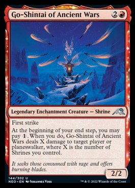 And if an opponent manages to destroy one of your Shrines, Go-Shintai has an ability that can return any enchantment from your graveyard to that battlefield. This can even trigger its token-making ability!
