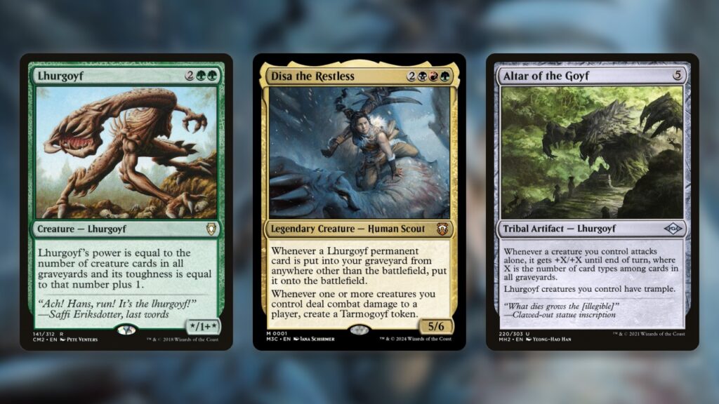 The second prong concerns the deck’s theming or rather the lack thereof. Based on the primary face commander, Disa the Restless, Graveyard Overdrive would appear to be some kind of Lhurgoyf typal deck. That being said, only six Lhurgoyf creatures appear in the deck, alongside Altar of the Goyf and Tarmogoyf Nest.