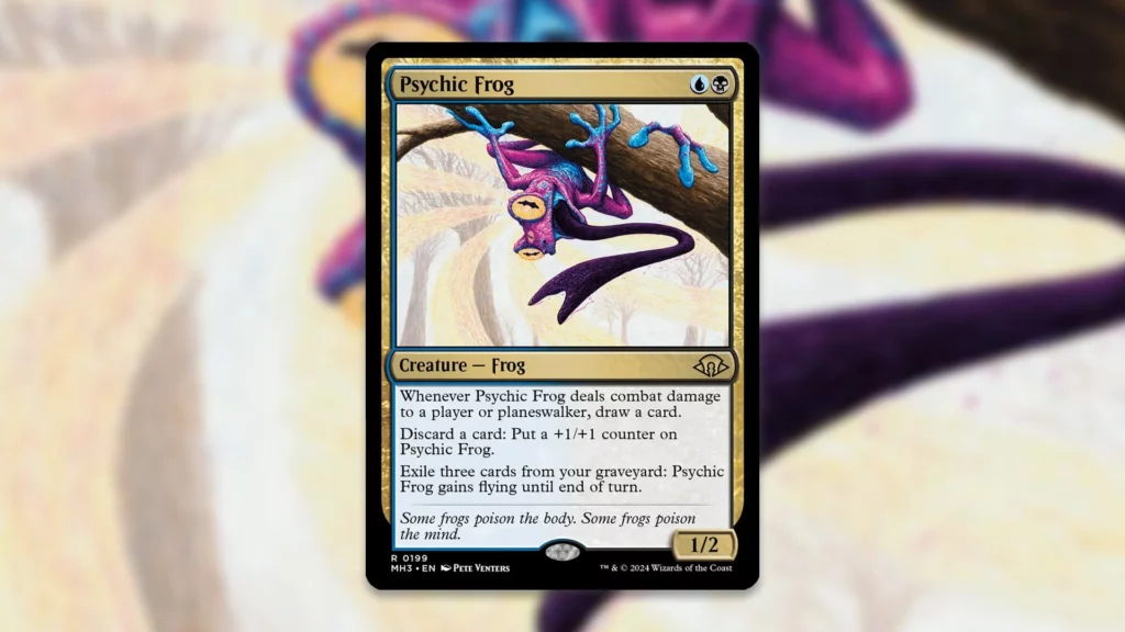 That brings us to the other discard outlet that leads to some of your most explosive draws: Psychic Frog. Psychic Frog does everything you want. It lets you discard cards on command without investing any mana. It grows in the process, so once you have Cauldron online, you’ll have a ton of mana to work with. It’s the perfect place to put +1/+1 counters from Proft’s Eidetic Memory since it can gain evasion on a whim. Plus, Psychic Frog is just a great card advantage machine on its own.