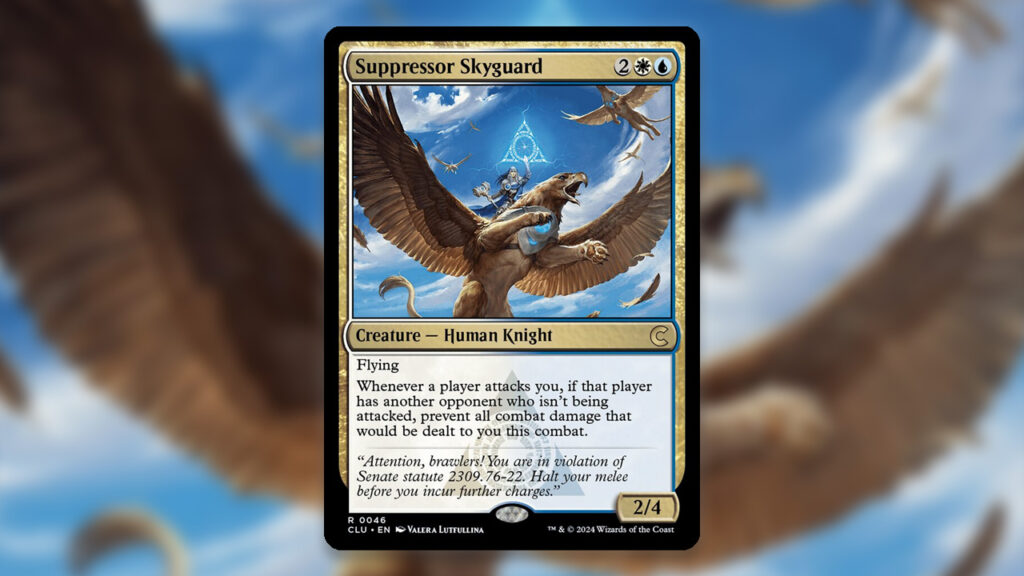 Suppressor Skyguard makes it quite difficult for opponents to deal meaningful combat damage to you. Unless they can point a creature towards all of their opponents, Suppressor Skyguard makes it so any combat damage you take is prevented. Even if opponents can get some creatures to swing your way for damage, the Skyguard forces them to split their army up. At best, this stone walls any attempt to threaten your life total. At worse, your opponents are forced to send some creatures in other directions.