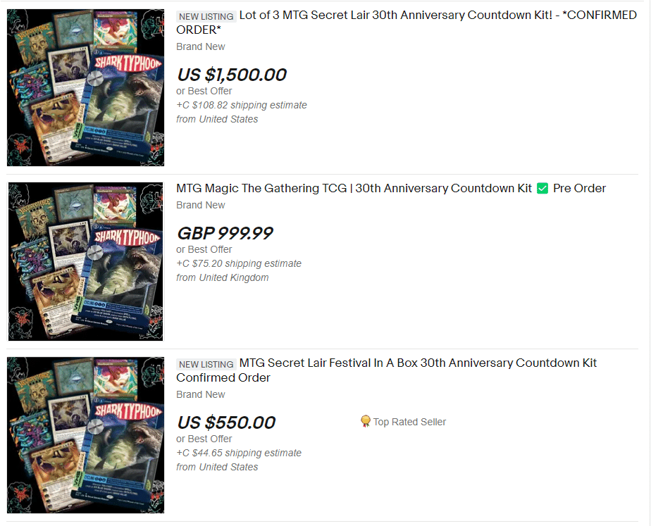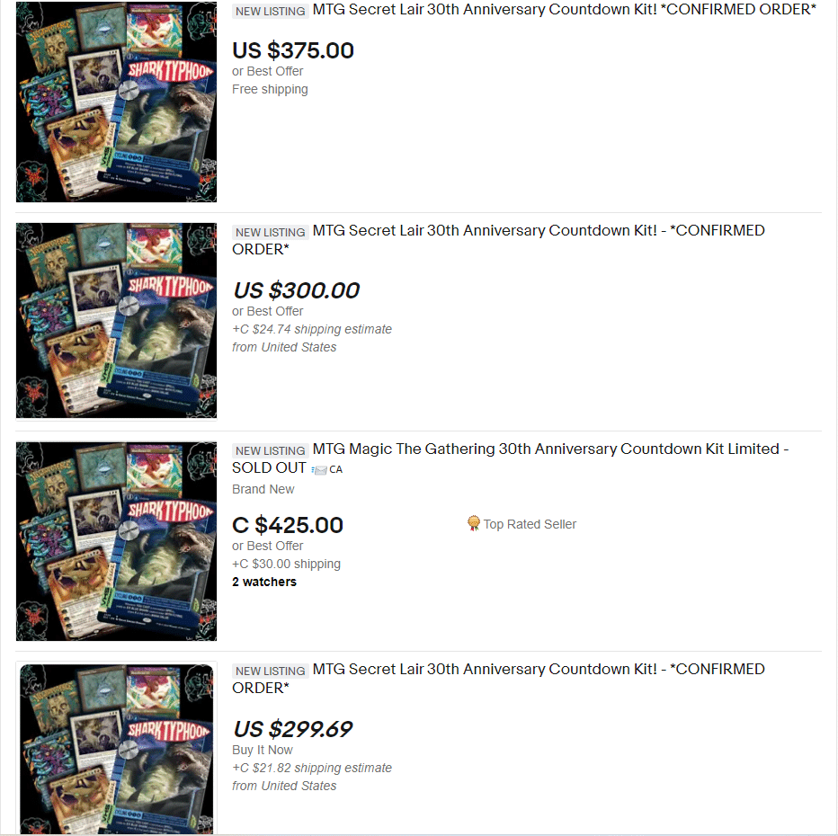 Because Wizards of the Coast wanted to make sure that these products would ship to players at the beginning of December so they could open them as intended, the 30th Anniversary Countdown Kit was printed at a limited quality. This quantity didn’t seem to match the demand for the product, as the product was sold out in most stores before an hour had passed. The sole exception was the European store, which can only ship to the UK.
