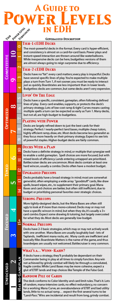 - Using the Prebuilt/Upgraded Prebuilt/High Power/cEDH guidelines, your decks will tend to be a 3/4, 5/6, 7/8, and 9/10, respectively. Combining these numbers with your average win attempt turn can give a really strong indication as to where your Commander deck stands.