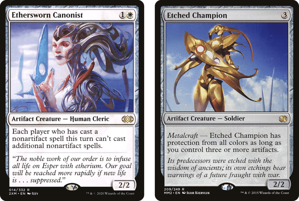 The sideboard can be upgraded over time too, primarily you’ll want Etched Champion and Ethersworn Canonist to offer resilience in games two and three. Sideboards often vary depending on the local metagame, but these two cards in particular are so good in Affinity they’re worth running either way. Then, you’ll want to pad out the rest of your sideboard with countermagic and removal. If you do acquire Urza’s Saga, picking up Soul-Guide Lantern and Pithing Needle would be the next step as these are excellent targets for the Enchantment Land.