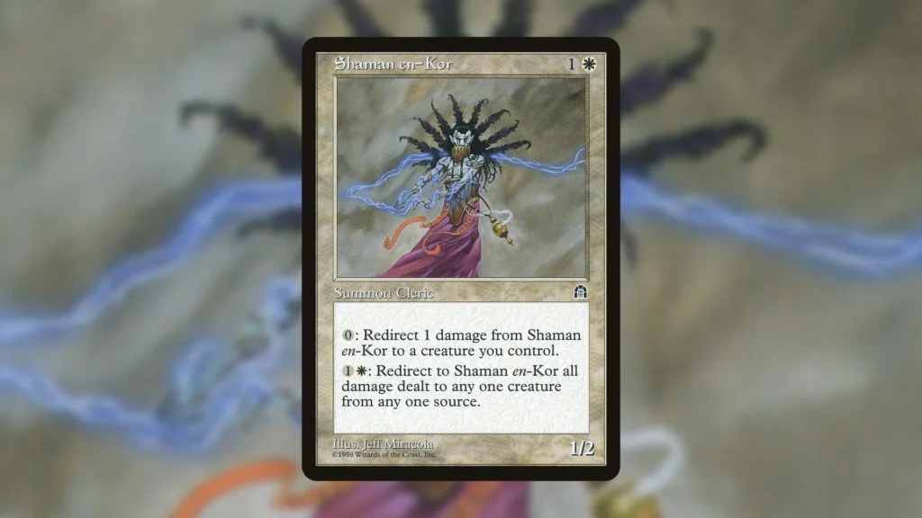 For two mana, Shaman en-Kor offers an effect that really only sees play in Legacy. Redirecting damage is a common way for older formats to go nuts with Nadu, Winged Wisdom, but in Commander, Shaman en-Kor is quite powerful alongside creatures with Stuffy Doll effects.