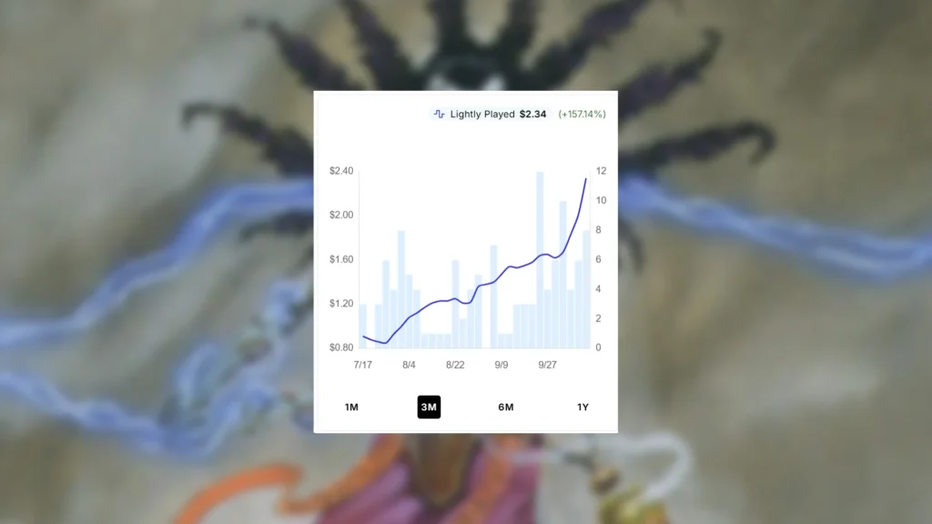 Because Shaman en-Kor’s only printing is 27 years old, there are very few near-mint copies that have traded hands. Lightly played copies instead paint a more realistic picture of Shaman en-Kor’s recent financial movements. Over the past three months, lightly played copies of Shaman en-Kor rose from just 85 cents to a $2.34 market average, representing a 238% price spike. Despite this, sales for the card, even in its lightly played condition, are all over the place.