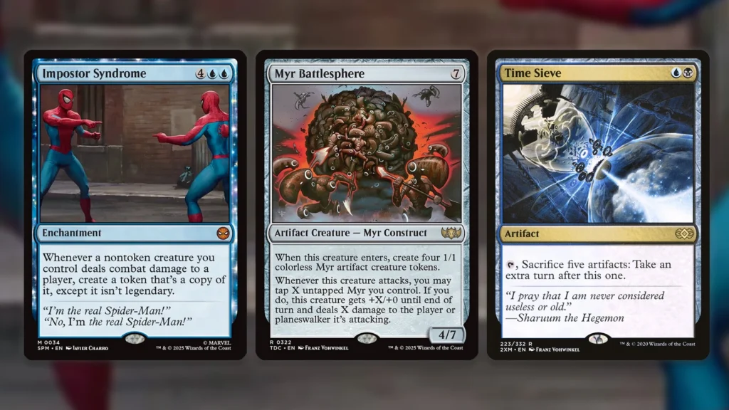 Finally, we wanted to highlight a three-card combo that takes an entirely different approach. This time around, you need Impostor Syndrome, Myr Battlesphere, and Time Sieve on the battlefield, as well as an open lane for Myr Battlsephere.