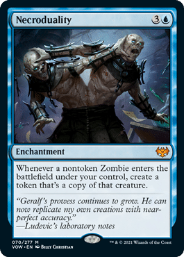 Necroduality is a very fun card. Getting a copy of Zombies that you play can be a very powerful tool to have. The downside is that this is a blue card. There aren’t any zombie decks in Standard, and the one that’s in Historic is Mono Black and hyper aggressive, so this may not fit in. That being said, this may be worth testing out in Historic as a splash card, as the creatures that exist in the current Zombies deck would be great to get copies of.