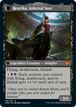 Now Henrika Domnathi / Henrika, Infernal Seer is a card that a vampire deck would want as a top end creature. This feels like a new Rankle, Master of Pranks. We have the flexibility to utilize her first two abilities if we have the time, but then we can transform her if we needed to. The flip side of her is pretty strong as well. I think that Henrika is going to definitely see some testing as the set comes out for Standard, but we’ll have to see how the meta shakes up to know if she’s sticking around.