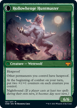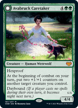Avabruck Caretaker / Hollowhenge Huntmaster is a CRAZY card. It’s front side has hexproof, so it’s a relatively safe card to play on it’s own, but then it has a benefit of buffing one of your guys. If you flip her, then EVERYTHING has hexproof and you pump up your entire team. I think that this definitely fits into the Standard Mono Green decks and can most likely find a home in a Mono Green Historic creature deck as well.