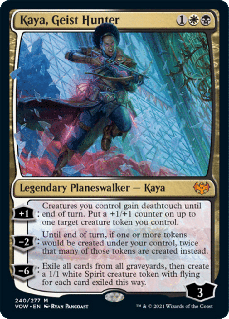 Our third and final planeswalker of the set is Kaya, Geist Hunter. 3 mana for a planeswalker is traditionally very strong, but the planeswalker needs to have some really good abilities for it to be good. I think that Kaya doesn’t necessarily fall into that category. She either needs creatures in play to protect her, or needs to be played late in the game when you have enough mana to double spell and create some tokens to go along with her -2. While there is some combo potential with Fynn, the Fangbearer, I think that’s a bit of a pipedream.