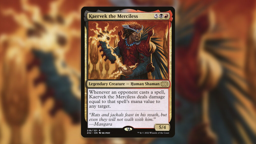 Mentions of Kaervek started appearing on MTG cards as early as 1996 in Mirage. While Kaervek himself did not get a card until much later, a few instants and sorceries in Rakdos colors were printed with his namesake. These include Kaervek’s Haze, Kaervek’s Spite, Kaervek’s Torch and Kaervek’s Purge.