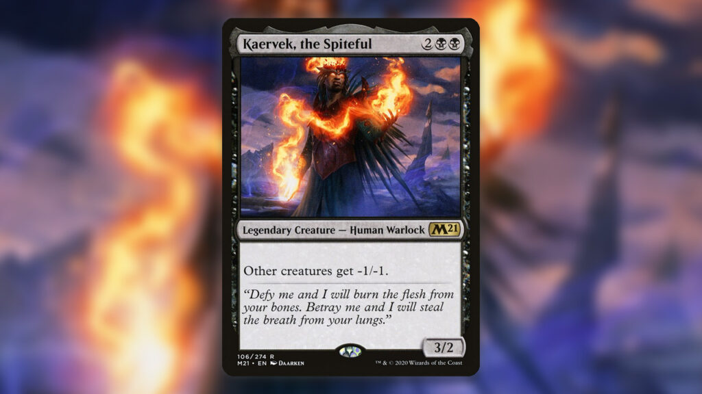 Kaervek, the Spiteful, another variant of this Legendary creature, appeared in core set 2021. This is the only printing of the card and, while it does not see much play currently, was somewhat popular when it was Standard legal. Notably, this one-off appearance has no story significance.