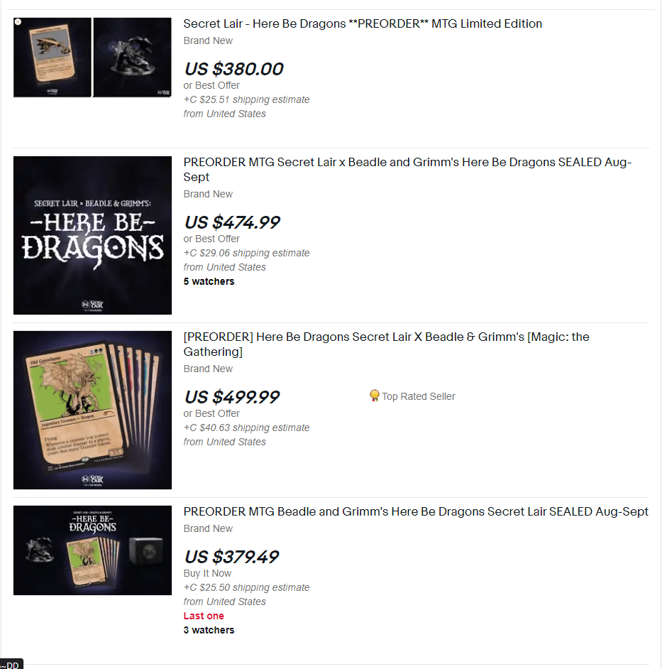 It did not take long for War of the Spark Mythic Editions to pop up all over the place on sites like eBay for three to four times its initial asking price. For the most part, they were selling for those prices too. This confirms that some of the Mythic Edition were bought up by investors. Is the same thing happening for the Here be Dragons Secret Lair?