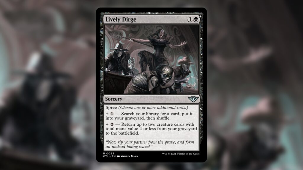 Before we sing its praises, let’s recap what Lively Dirge actually does. It’s a two mana sorcery, one and a black, with Thunder Junction’s new Spree ability, allowing two extra modes to be tacked on. For one extra mana, you can put a creature from your library into the graveyard, just like Entomb. For two mana, you can resurrect up to two creatures, with a total mana cost of up to four, from your graveyard.