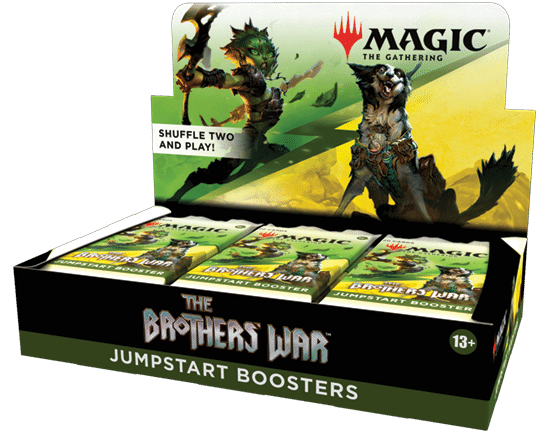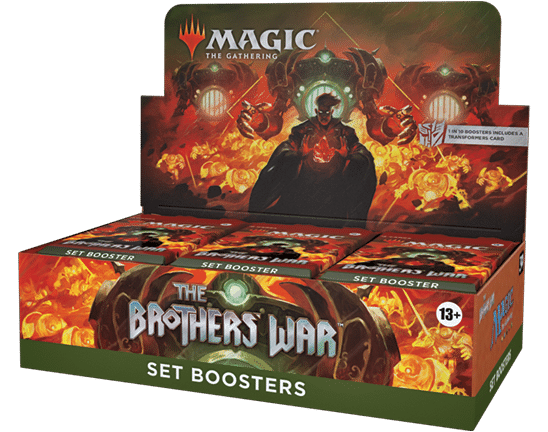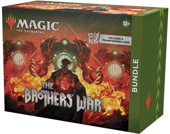 The ‘bundle’ products are an MTG favorite that contains an offering of new booster packs from the namesake set alongside some bonuses. In the case of The Brothers’ War, one should expect eight Brothers’ War Set Boosters; one Transformers card included with the opportunity to find more in booster packs, one foil Retro-Frame alt-art Queen Kayla bin-Kroog promo card, a basic land bundle containing 20 foil and 20 non-foil basic lands, and one of two gigantic Brothers’ War themed D20s.