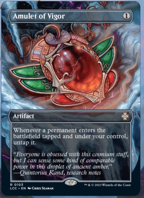 Amulet of Vigor is yet another homerun reprint that can appear as a box topper for The Lost Caverns of Ixalan. Most famously found in its namesake Amulet Titan Modern combo deck, Amulet of Vigor can untap any permanent that enters the battlefield tapped.