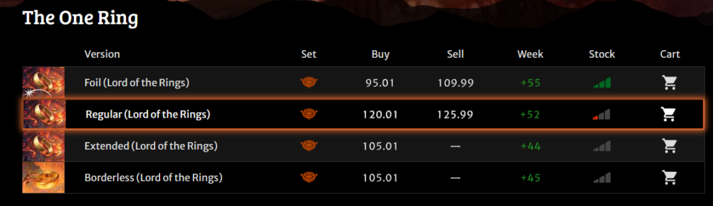 Either way, these prices are pretty interchangeable, both worth about $55 each. This, however, has not stopped multiple sales for these cards at $80 or more. In a rush for players to acquire copies of The One Ring, it’s not uncommon to see premiums like this being paid.
