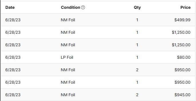 On June 28, players finally got a comprehensive list of Extended Art Foil cards exclusively available in the Lord of the Rings Collector Booster Sample Packs, and this iteration of The One Ring was on that list. Since that revelation came to pass, prices for these cards on TCGplayer skyrocketed. This is a list of all The One Ring sales that occurred the day that this list was unveiled. The $80 outlier for a lightly played version of this card is particularly interesting, but the message is clear. These cards are expensive.