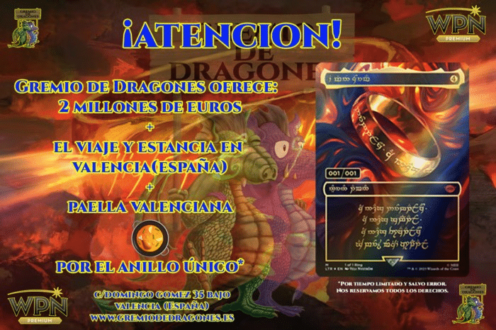 We’d be remiss not to mention the one-of-one copy of The One Ring that has turned opening Lord of the Rings: Tales of Middle-earth Collector Booster packs mainstream. The current high bid on this card is for a bit over two million dollars from an LGS named Gremio Des Dregones. The exact offer is actually two million Euros, which works out to about $2,177,400. Should this card sell for its bounty, it would be the most expensive MTG card ever.
