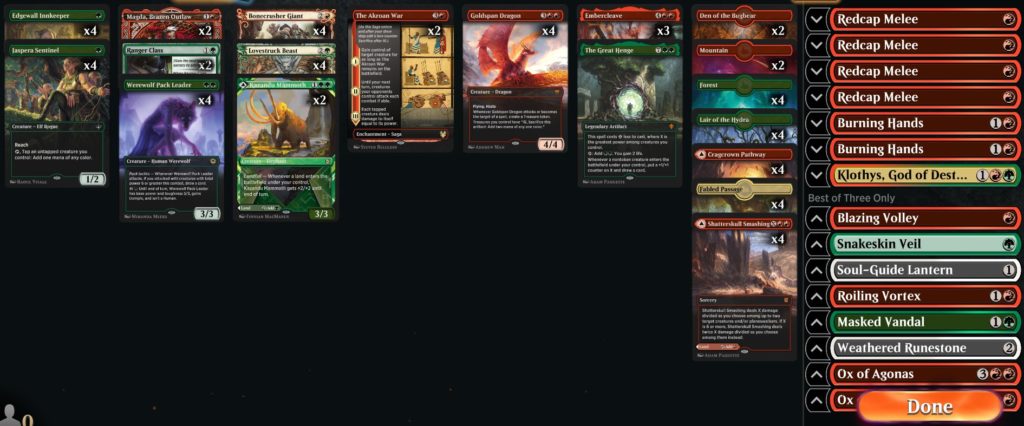 Crockeyz played an aggressive Gruul (red/green) Standard deck with the adventure package from Throne of Eldraine like Edgewall Innkeeper, Bonecrusher Giant, and Lovestruck Beast while taking advantage of the power of newer cards like Werewolf Pack Leader, Ranger Class, and Goldspan Dragon. The deck also runs copies of Jaspera Sentinel and Magda, Brazen Outlaw to help ramp up mana to play the bigger spells like Embercleave and The Great Henge.