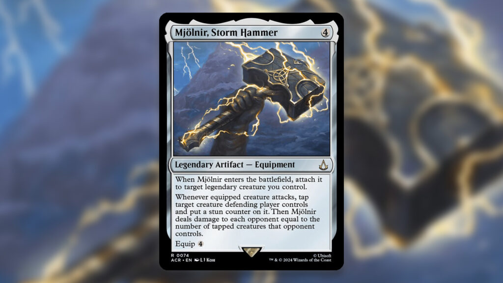- Card Text: When Mjolnir enters the battlefield, attach it to target legendary creature you control. Whenever equipped creature attacks, tap target creature definding playe controls and put a stun counter on it. Then Mjolnir deals damage to each opponent equal to the number of tapped creatures that opponent controls.